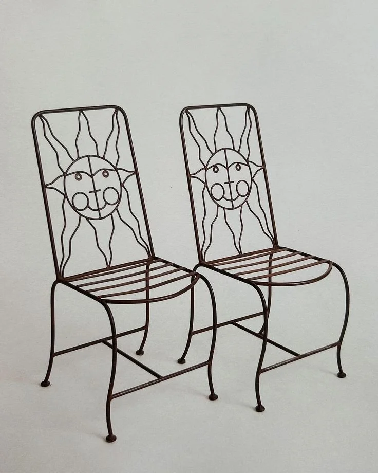 From often-pinned Bruises Gallery, these vintage, hand-wrought iron with a sunburst motif that feels like a joyful nod to mid-century garden furniture and tarot cards. These were made for outdoor lounging but would look just as good inside, paired with crisp linen or a velvet cushion for contrast.