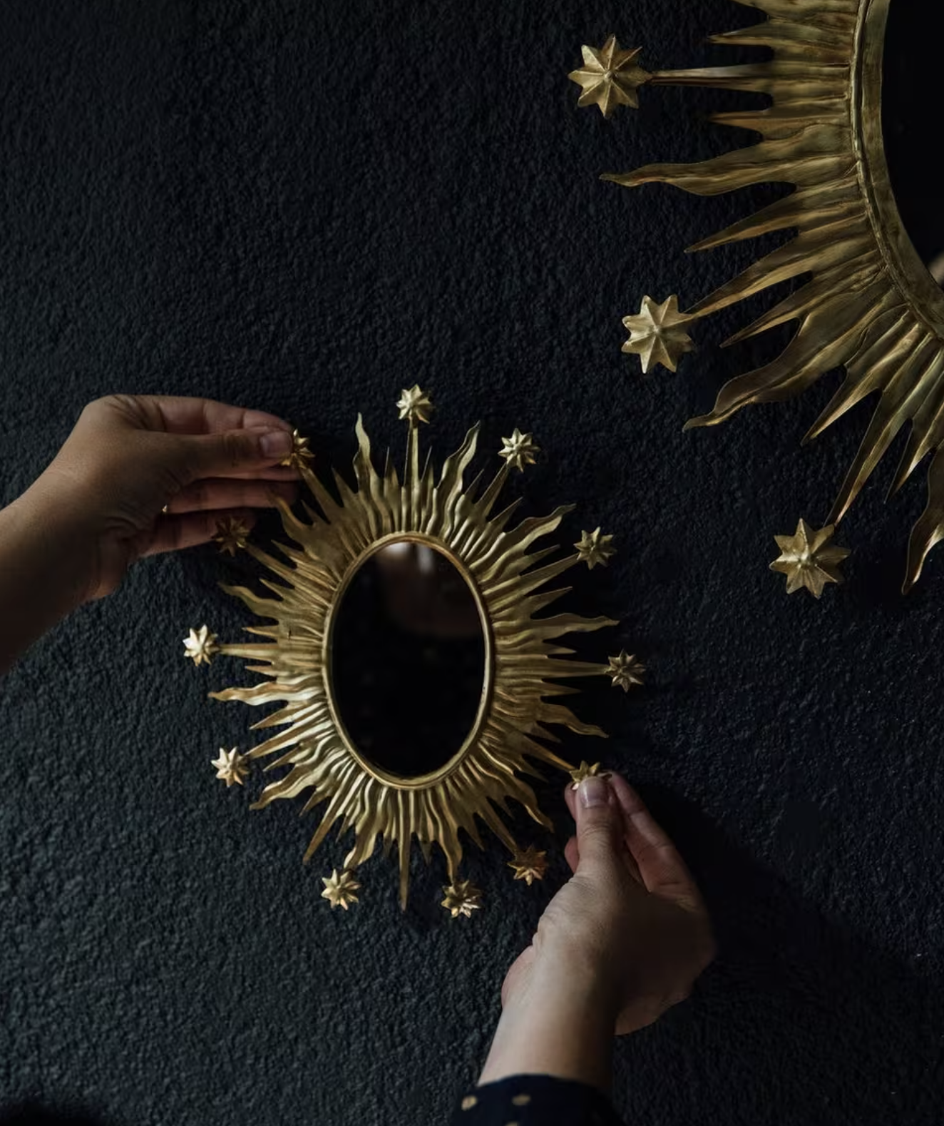 The tiny scale of this mirror - sold at Liberty London, a personal favorite store - creates a small moment referencing the universes’ biggest. From Lyon-based Boncoeurs, this mirror channels sacred iconography and sun cult aesthetics. Made from hand-cast brass, it feels part Catholic relic, part 70s French flea market. Hang it alone or with a few stars for your own little domestic constellation.