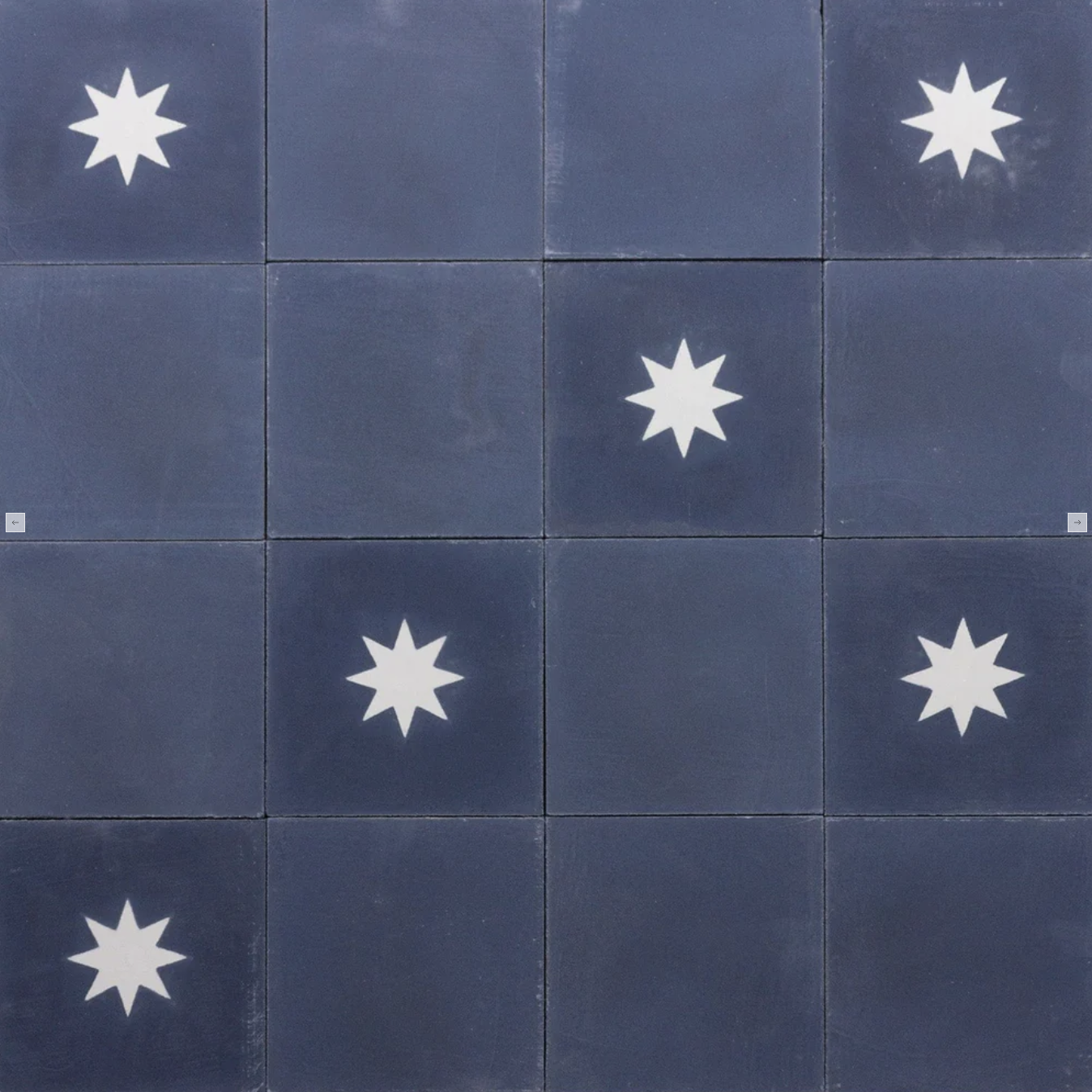 These encaustic tiles are made from natural pigments and cement, with each piece hand-poured in Spain. The crisp white star motif references vintage Southern European flooring, but the navy background keeps it bold and modern. Ideal for entry floors, splashbacks, or star dusted powder rooms.